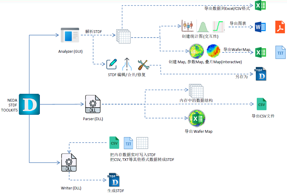 • NEDA Parser Library,一个供二次开发使用的解析库。可以用来开发客户公司自己的测试数据仓库, 利用NEDA Parser把完成生产的STDF文件的后台解析并存入数据库,或者自动转换成CSV文件,或者自动生成Wafer Map文件等。 NEDA Parse Library可以更新MIR记录,可以用来开发自动更新MIR的脚本程序。